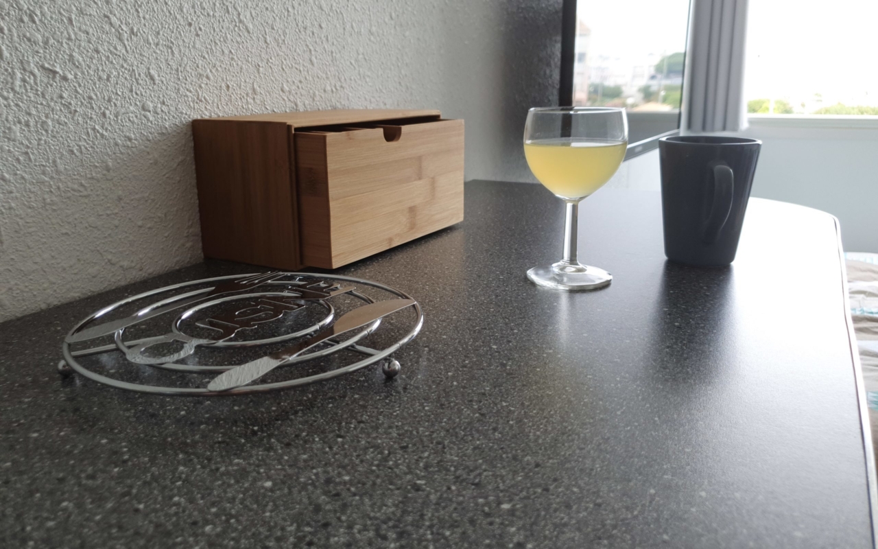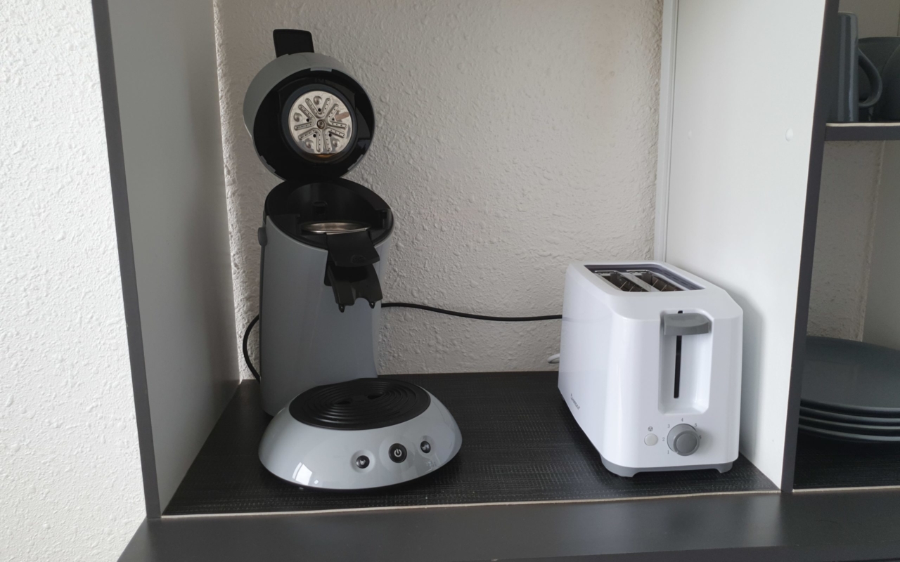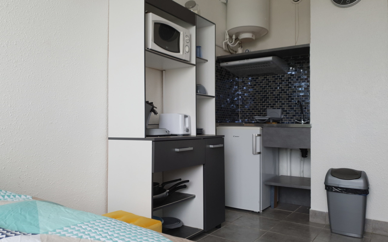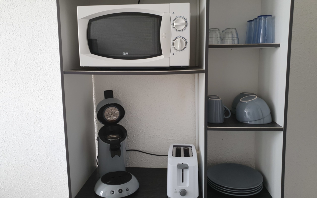 – Cuisine équipée (Micro-ondes, cafetière à dosettes, grille-pain, bouilloire, plaques de cuisson, casseroles, vaisselle…)